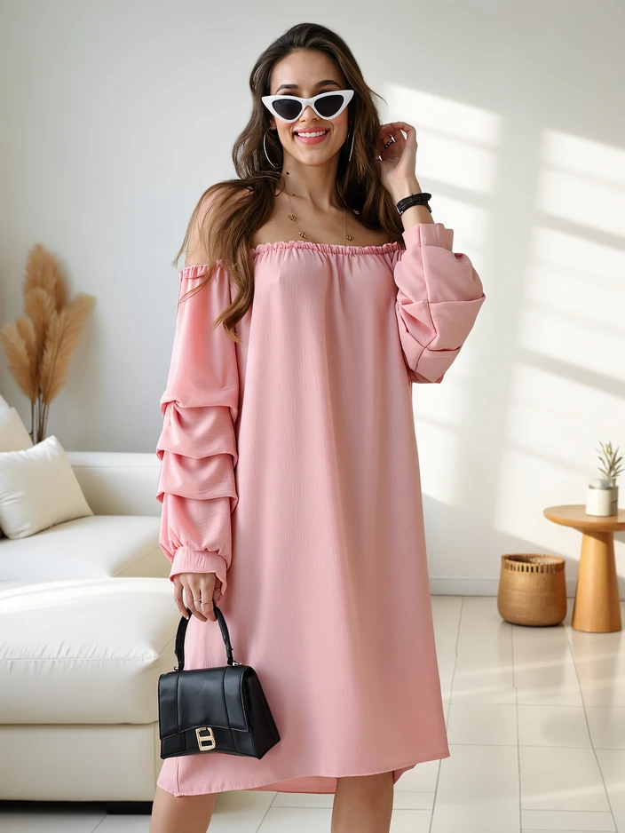 - Фабулозна рокля в испански стил, изработена от лека,flowing тъкан. Модел до коляното с дълги ръкави, украсени с ръбове и еластичност на деколтето, подчертаваща силуета. Пълна с чар и лекота!