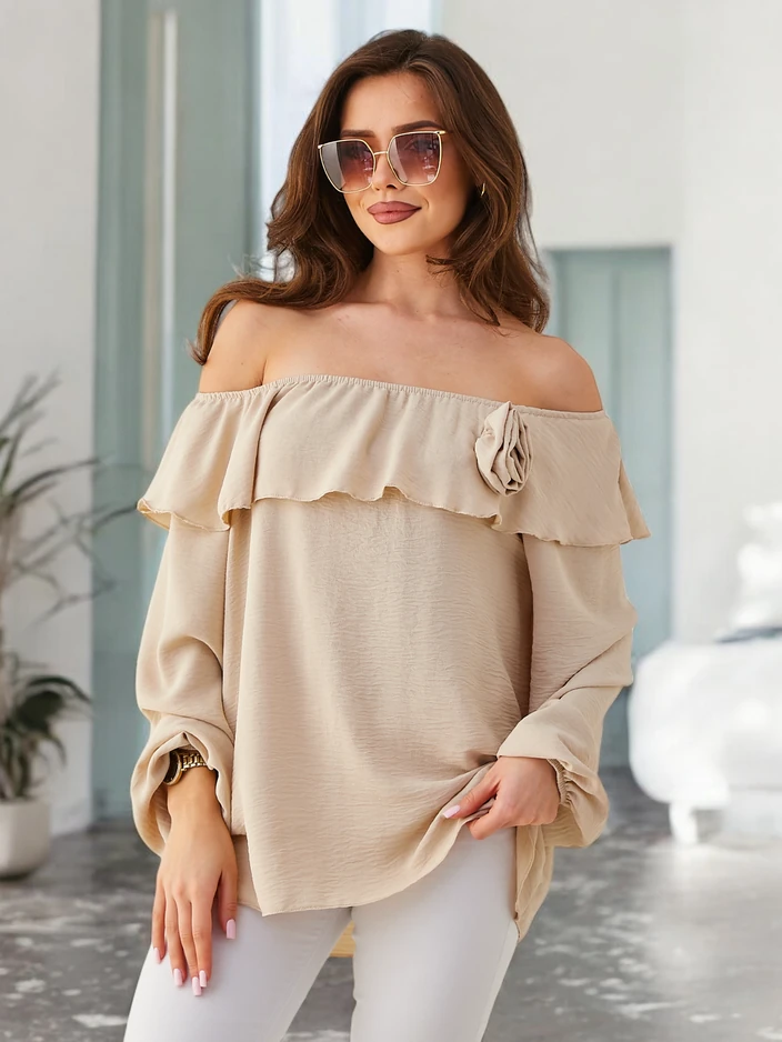 - Топът с открито рамо и волан около деколтето е елегантен и женствен вариант за всякакъв повод. С еластичен ластик около деколтето и дълги ръкави, той перфектно приляга на силуета, осигурявайки комфорт и свобода на движение. Нежният волан придава лекота и