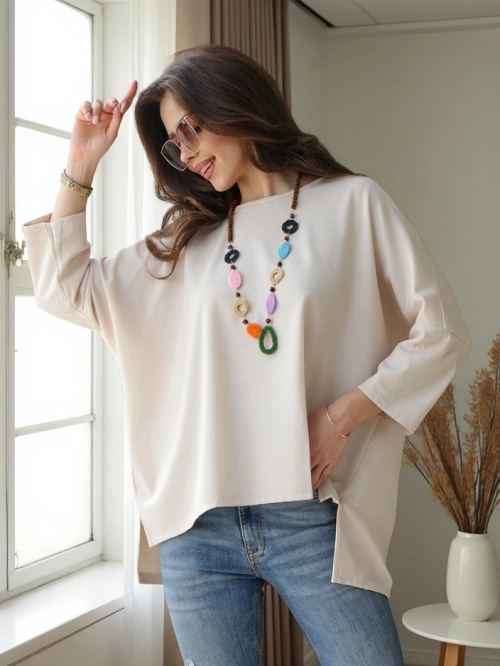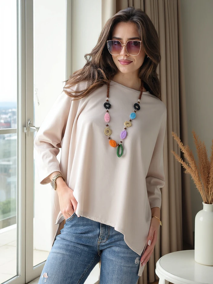 - Оригинална женска блуза с кръгло деколте, изработена от приятен и мек текстил. Този продукт има свободно падаща кройка и 3/4 дължина на ръкавите. Допълнително, в комплекта е включено и колие. Идеален избор за създаване на стилни аутфити!