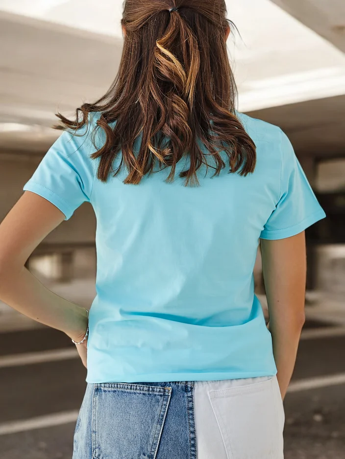 - Оригинална женска блуза с кръгло деколте, изработена от мек и приятен на допир текстил. Цялото е украсено с дискретен надпис, а късият ръкав придава лекота. Перфектен избор за създаване на модни и стилни аутфити!