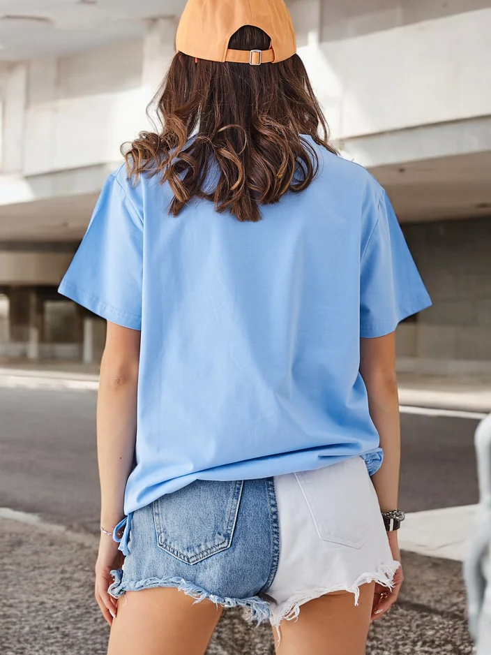 - Оригинална дамска блуза с кръгло деколте, изработена от мека и приятна на допир материя. Цялото изделие е декорирано с фин надпис, а късият ръкав придава лекота. Отличен избор за създаване на модерни и стилни аутфити!