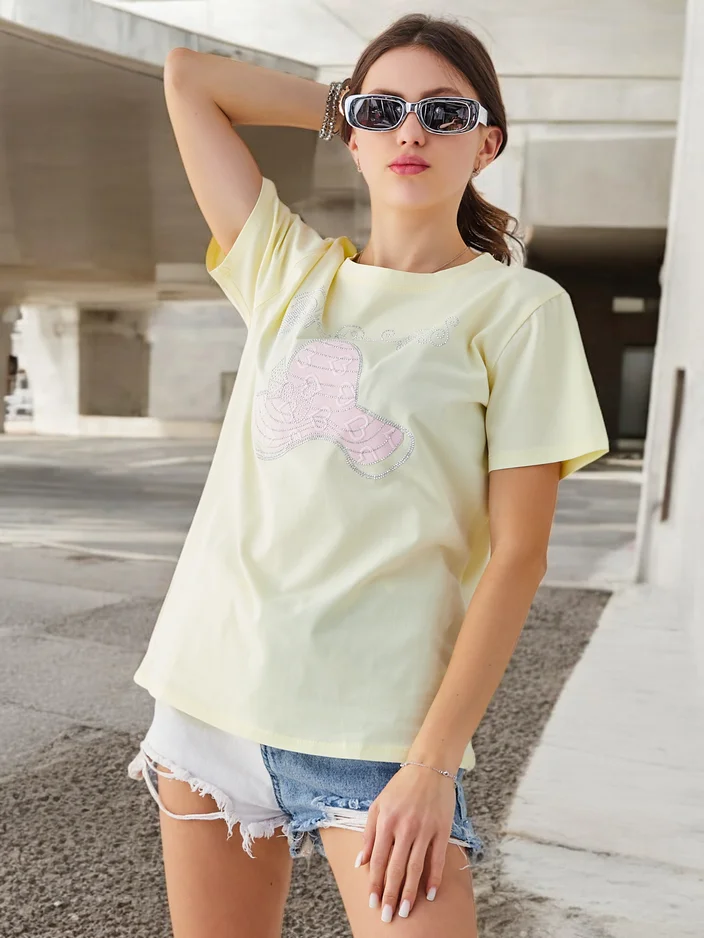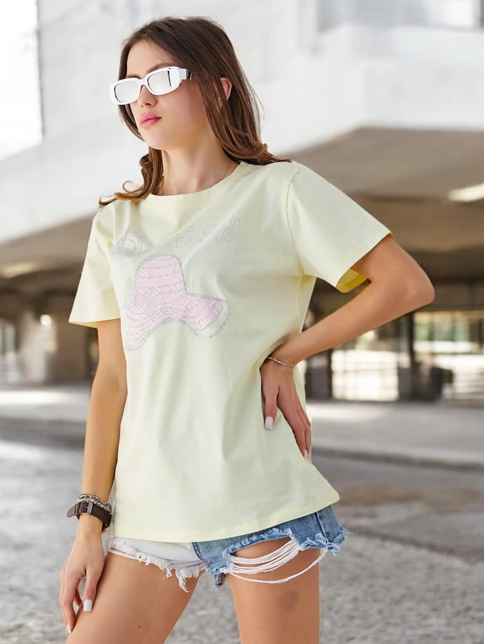 - Оригинална дамска блуза с овално деколте, изработена от мека и приятна на допир тъкан. Цялото изделие е украсено с впечатляващ принт, а късият ръкав добавя лекота. Перфектен избор за създаване на модни и стилни аутфити!