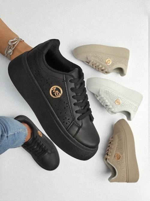 - Дамски ажурни сникърси от еко кожа и текстилна стелка на платформа, съчетаващи комфорт с модерен стил. Идеални за всеки ден, осигуряват лекота и удобство, а финият дизайн добавя елегантност към всяка визия.