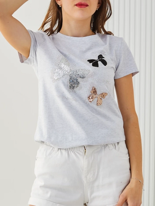 - Оригинална дамска блуза с кръгло деколте, изработена от мек и приятен на допир плат. Цялото е украсено с привлекателни пайети, а късите ръкави придават лекота. Перфектен избор за създаване на модни и стилни аутфити!