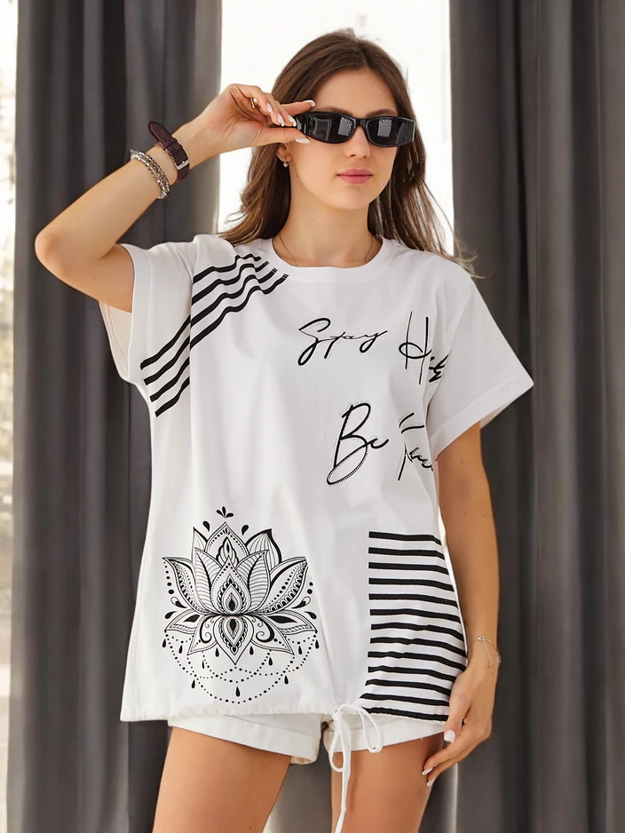 - Дамската памучна тениска е лек и удобен избор за всеки ден. Вдъхновена от положителен слоган, тя е перфектна за неформални стилове. Меката тъкан осигурява комфорт, а минималистичният дизайн я прави подходяща за различни аутфити.
