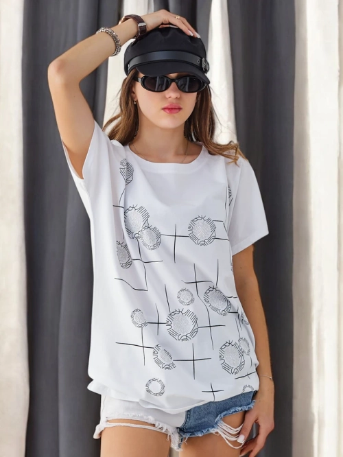 - Тази дамска памучна тениска е лек и удобен вариант за всеки ден. Вдъхновена от позитивен слоган, тя е перфектна за неформални аутфити. Меката материя осигурява комфорт, докато минималистичният дизайн позволява да се съчетава добре с различни тоалети.