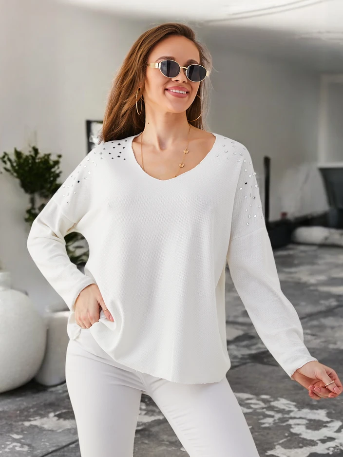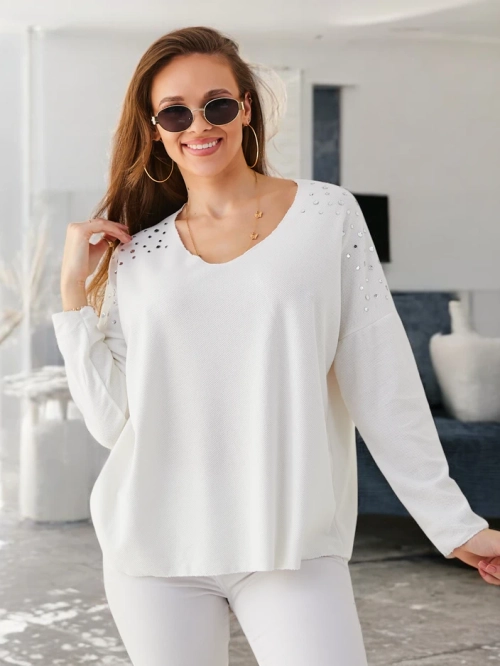 - Дамски пуловер с V-образно деколте, направен от приятен плат. Моделът има дълги ръкави. Украсен е с камъчета на раменете. Идеална основа за зимни аутфити!