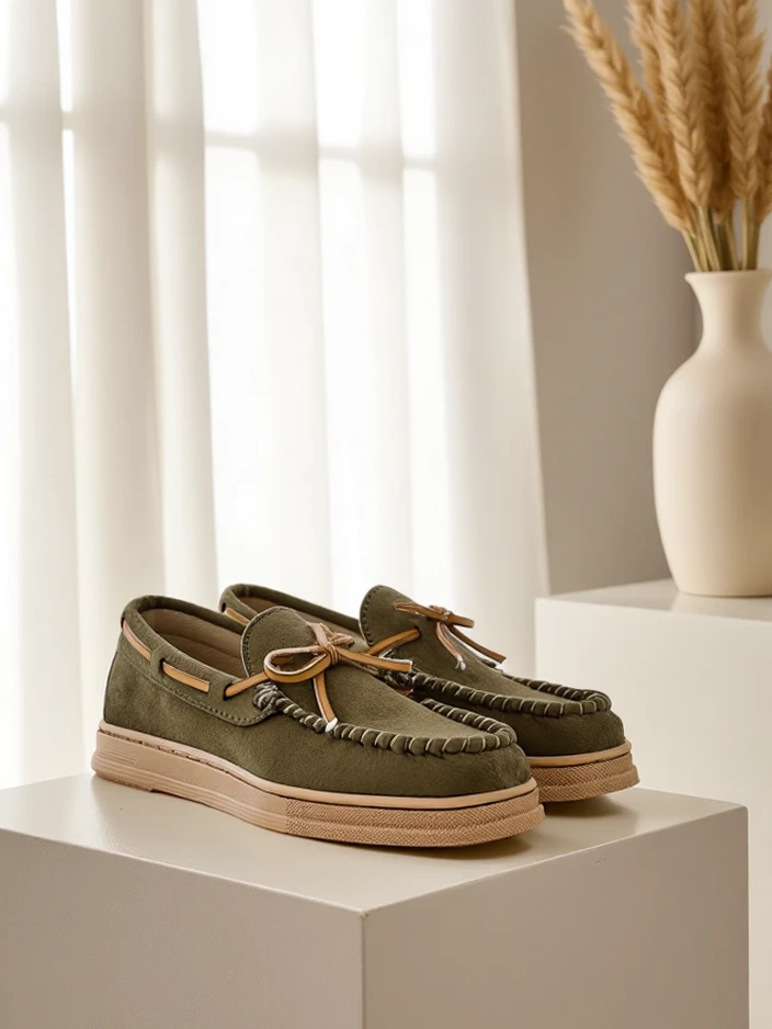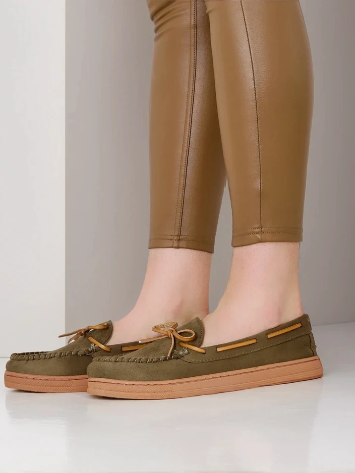 - Модерни дамски мокасини на плоска подметка. Чифтът е изработен от еко-кожа от суед. Вътрешността е облицована с мек текстил. Пръстът е украсяван с панделка. Перфектни за неформални аутфити!