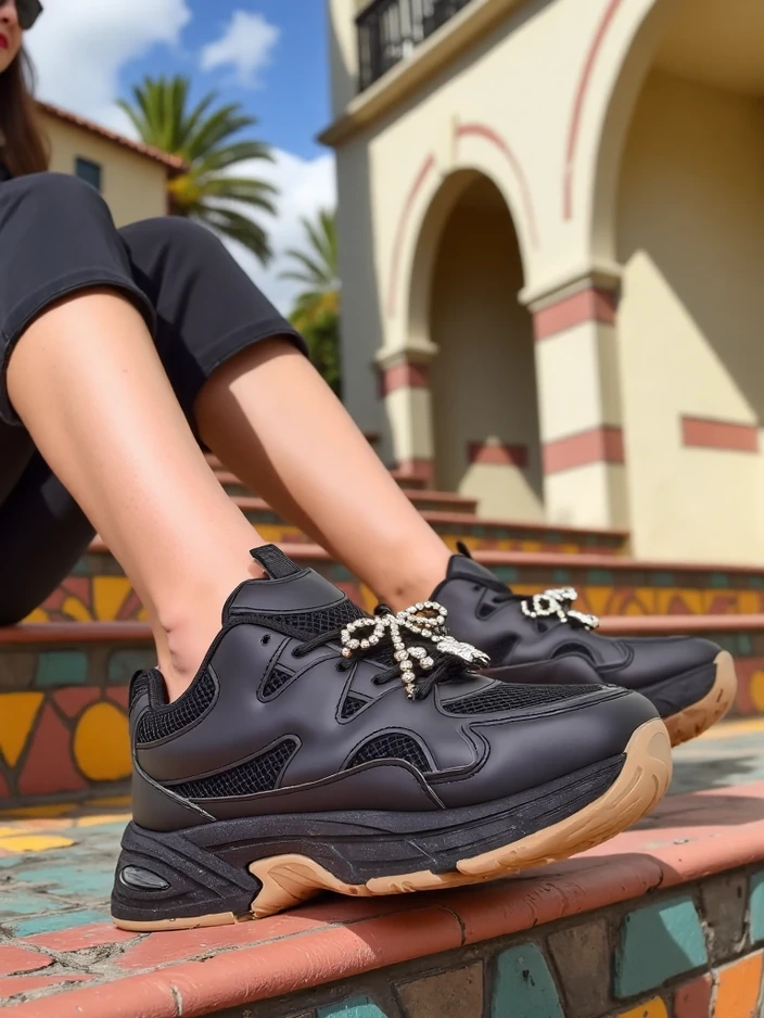 - Дамски спортни обувки, изработени от еко кожа и мрежа. Модел с по-дебела подметка. С връзки. Те ще бъдат чудесни за ежедневни аутфити! Украсени с подвижна верижка.