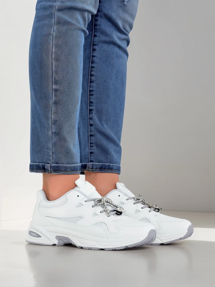 - Дамски спортни обувки, изработени от еко кожа и мрежа. Модел с по-дебела подметка. С връзки. Те ще бъдат чудесни за ежедневни аутфити! Украсени с подвижна верижка.