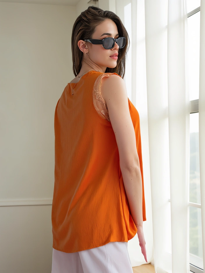 - Елегантна безръкава дамска блуза, която подчертава женствената деликатност. Меката материя обгръща силуета, докато V-образното деколте и дантелата придават изтънченост. Перфектна за ежедневно носене, както и за специални поводи!