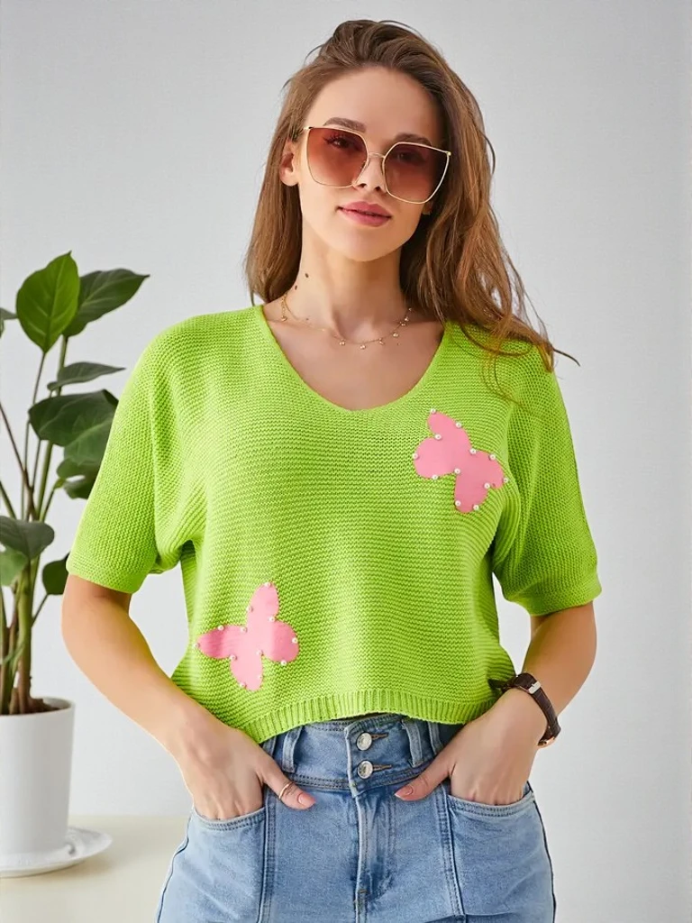 Royalfashion Женски памучен къс пуловер с пеперуди