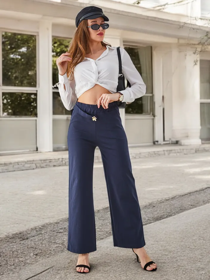 Royalfashion памучни широки дамски панталони с декорация, подобна на колан