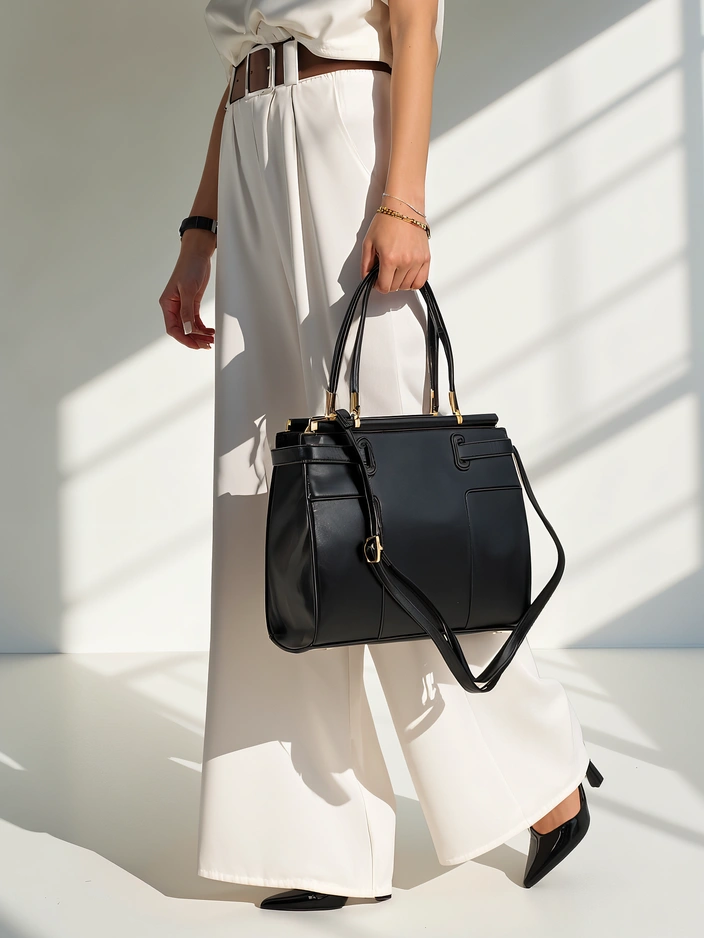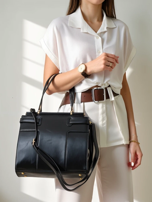 - Голяма дамска чанта, изработена от еко-кожа и затваряща се с цип. Моделът разполага с: - 1 отделение с преграда - 1 външен джоб с цип - 4 вътрешни джоба;