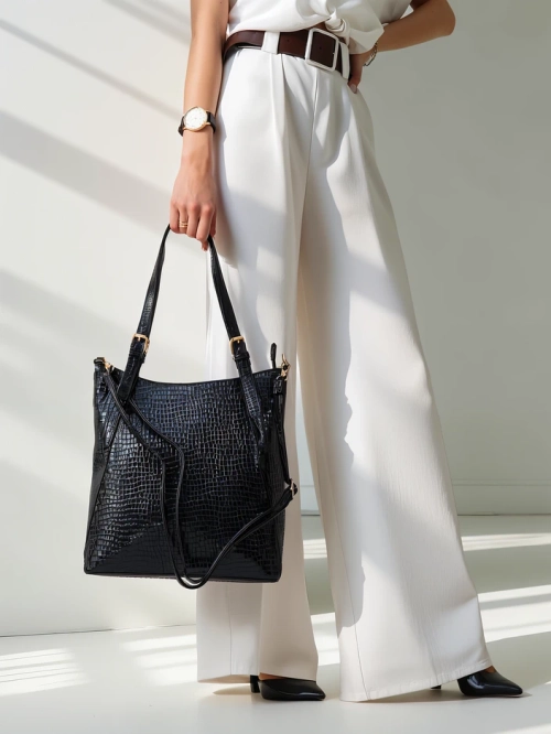 - Голямата дамска чанта е изработена от лакова еко-кожа с релеф и със закопчаване с цип. Моделът разполага с: - 1 отделение; - 1 външен джоб с цип; - 3 вътрешни джоба;