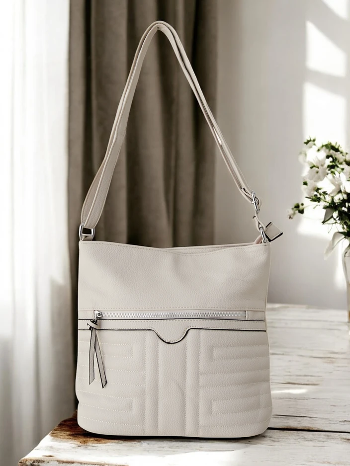 - Дамска чанта с цип, направена от екологична кожа. Моделът има 1 отделение, 3 вътрешни джоба и 2 външни джоба. Освен това разполага с регулируема дръжка. Перфектна за ежедневно ползване!