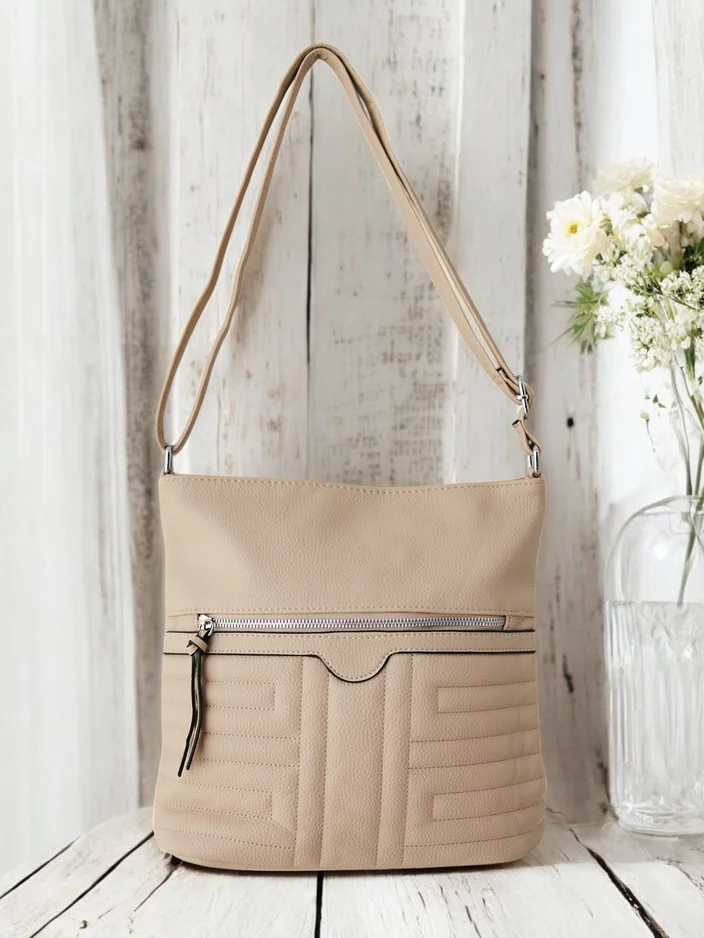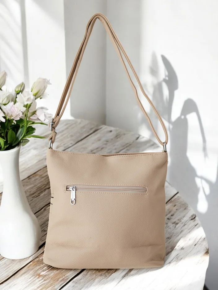 - Дамска чанта с цип, направена от екологична кожа. Моделът има 1 отделение, 3 вътрешни джоба и 2 външни джоба. Освен това разполага с регулируема дръжка. Перфектна за ежедневно ползване!
