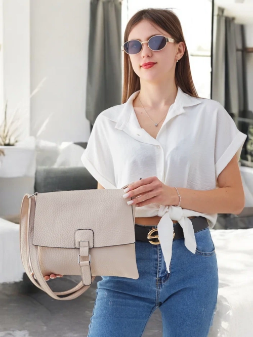 • Дамска чанта с цип, изработена от екологична кожа. Моделът разполага с 1 отделение, 3 вътрешни джоба и 2 външни джоба. Допълнително има регулируема дръжка. Перфектна за ежедневна употреба!