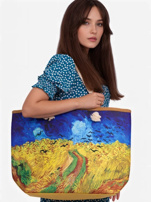- Стилна платнена чанта с печат. Чантата има дълги дръжки, с цип и съдържа 1 джоб отвътре. Идеална е за плажа!