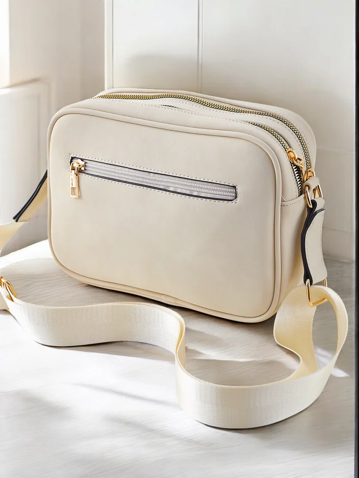 - Дамска малка чанта с цип, изработена от еко-кожа. Моделът разполага с 2 отделения и външен джоб. Освен това има сваляща се, регулируема дръжка. Перфектна за всекидневна употреба!