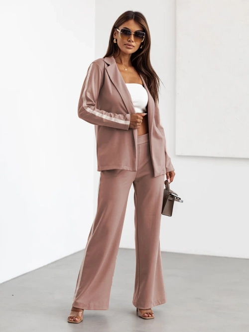 - Оригинален женски комплект, изработен от приятен текстилен материал. Дълъг ръкав суетшърт без качулка и без закопчалки. Широки панталони с еластичен колан и 2 джоба. Целият комплект е украсен с ивици. Елегантност и стил в едно!