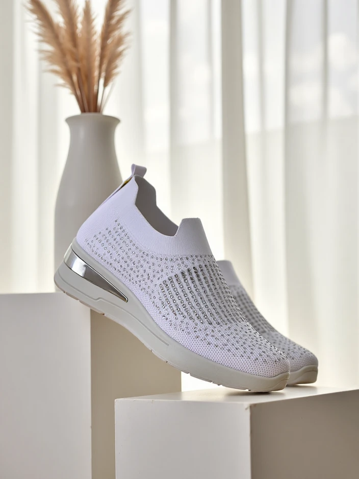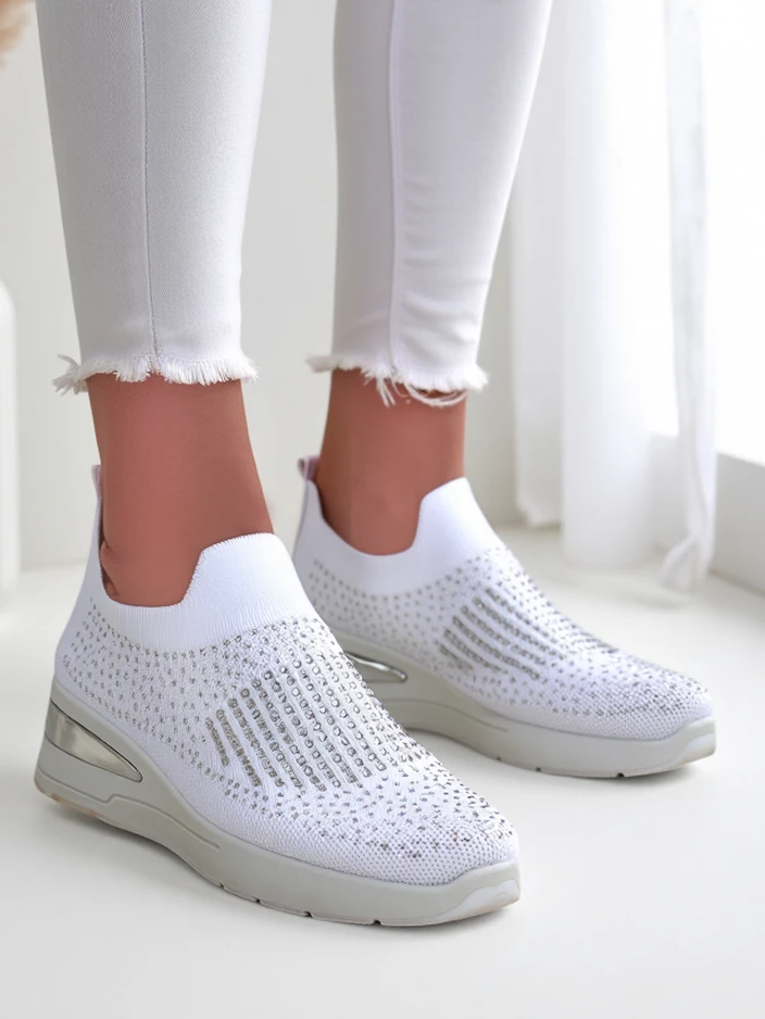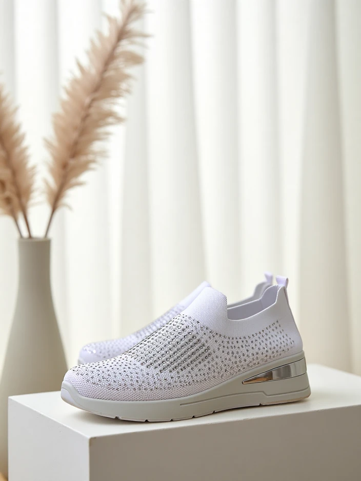 - Модерни дамски обувки с платформа, изработени от плат, украсени с камъни. С мека текстилна инsole. Обувки тип слип-он. Те ще бъдат прекрасно допълнение към ежедневния стил.