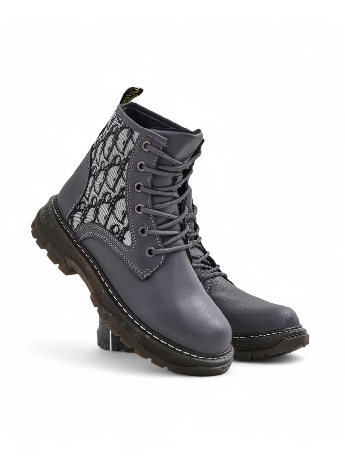 - Удивителни дамски ботуши до глезена с плосък ток, изработени от еко-кожа и плат с принт. Интериорът е запълнен с плат. Модел с връзки.
