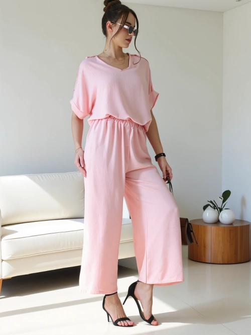 - Дамски комплект, изработен от приятна материя. Блузата има V-образно деколте и къси ръкави. Широките панталони имат еластична талия. Задължителен артикул за този сезон! ЗАБЕЛЕЖКА: Точността на измерванията (+/-) 1 см.