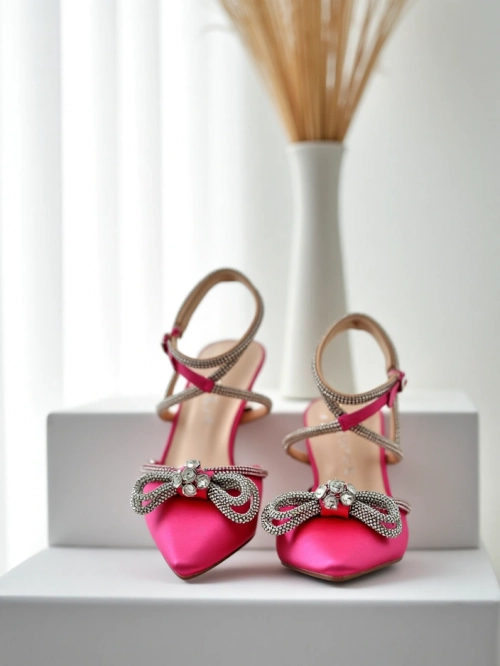 - Женски обувки с тънък ток без ток. Моделът е покрит с сатеноподобен материал и има стелка от еко-кожа. Заостреният нос придава чувствена елегантност. Носете ги с елегантна рокля!