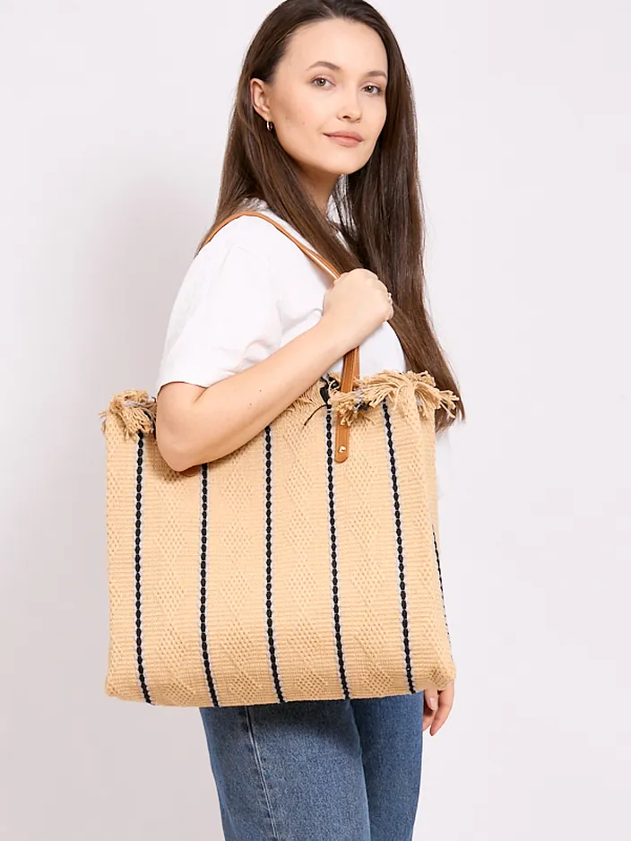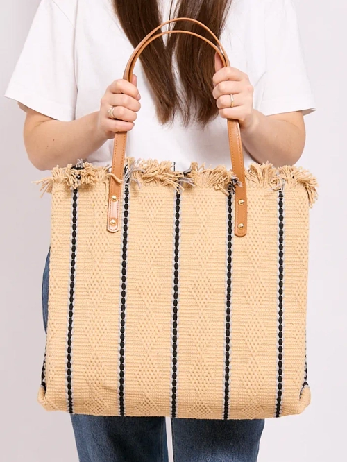 - Плетена чанта с райета. Продуктът има цип и разполага с ципен джоб вътре. Много забележителен аксесоар.