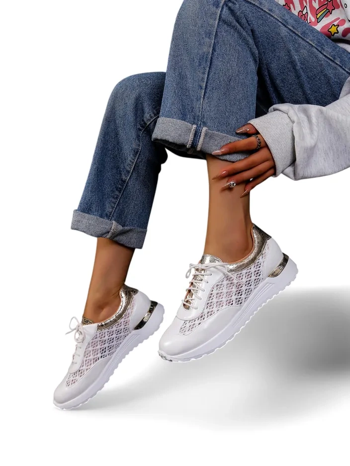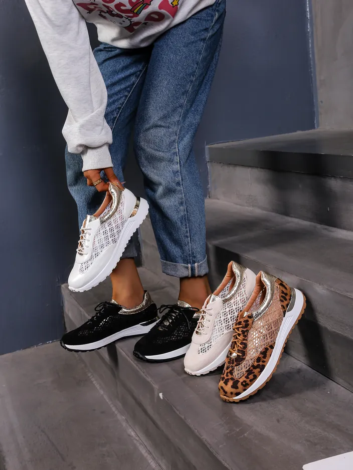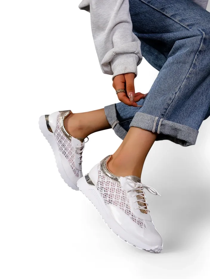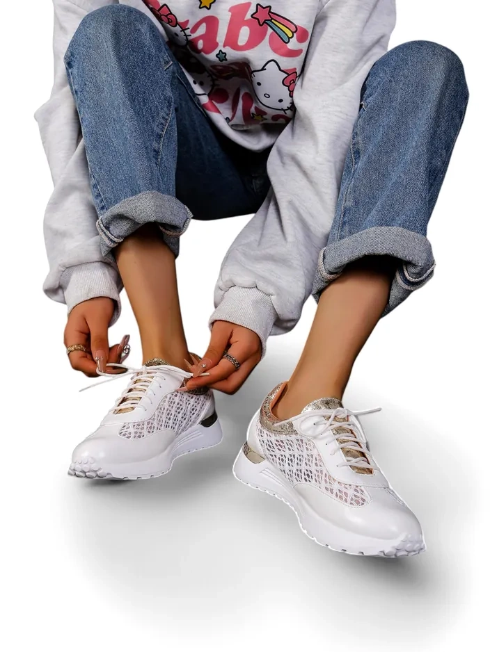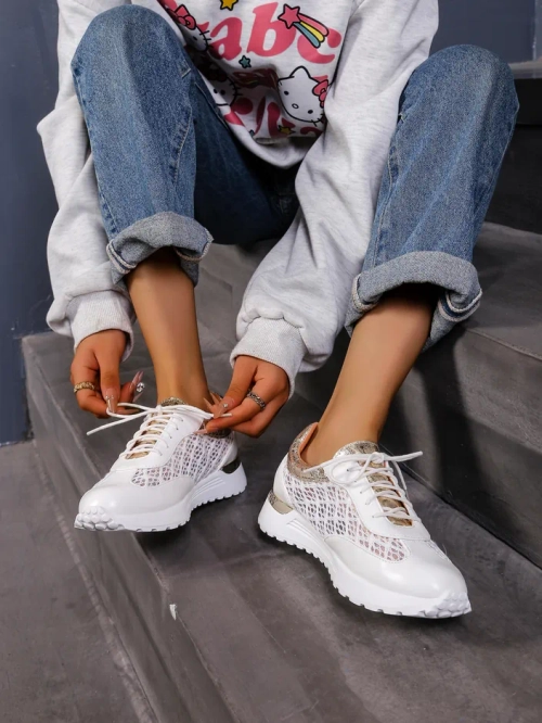 • Оригинални дамски маратонки на равна подметка - перфектната комбинация от стил и комфорт. Обувките са изработени от еко-кожа и мрежа. С връзки, с текстилна стелка. Идеални за активни хора!