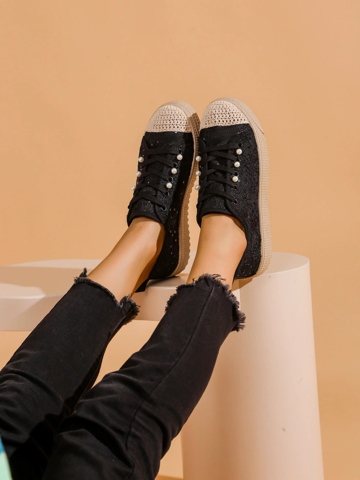 - Женски обувки с плоска подметка. Тази касуална двойка е изработена от текстилен материал с дантела и текстилна стелка. Моделът разполага с декоративни пайети. Перфектни за онези, които ценят комфорта!