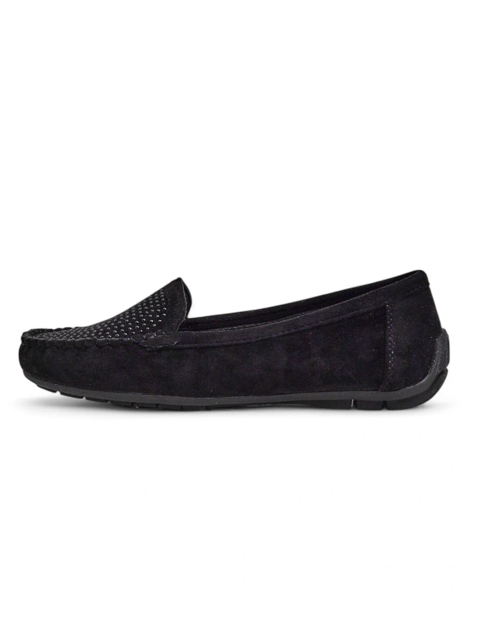 - Красиви женски лофери с плоска подметка. Моделът има неформален стил и е изработен от еко набук и еко-кожена стелка. Чаушът е заоблен и декориран с декоративни камъни. Идеална основа за много ежедневни визии!