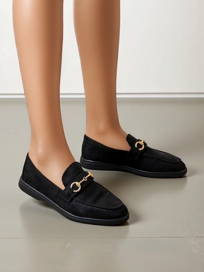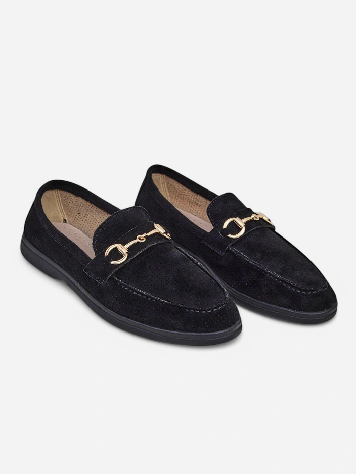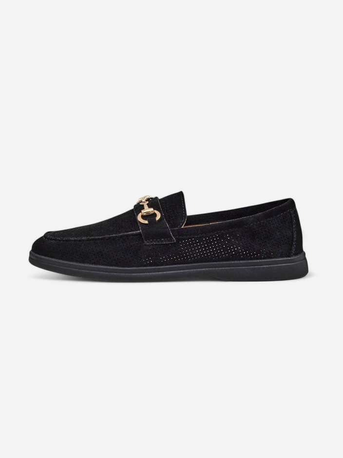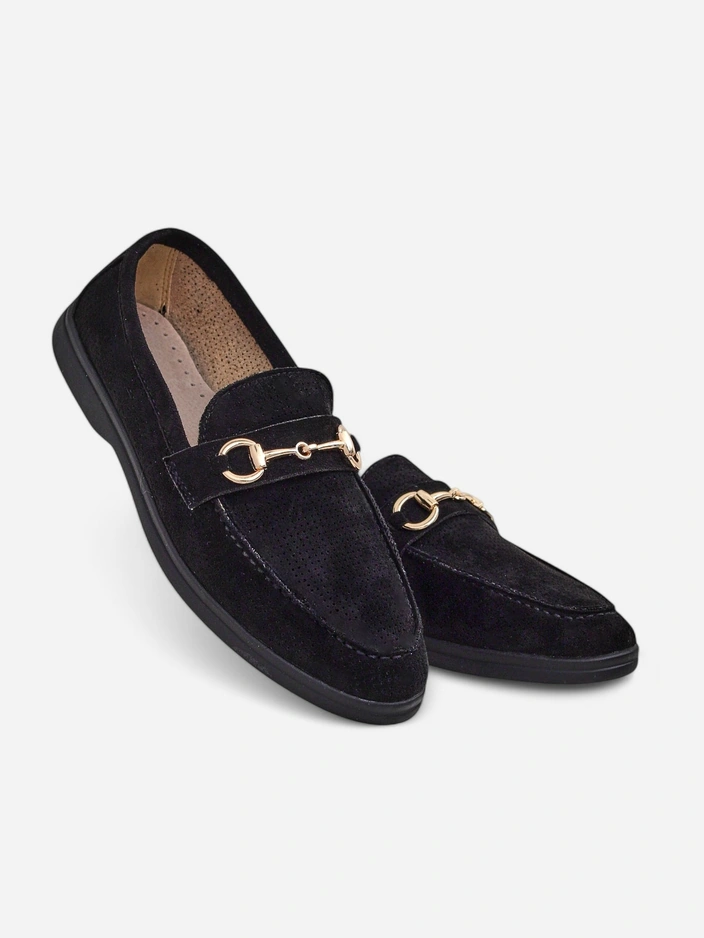 - Перфорирани дамски мокасини с плоска подметка. Моделът е изработен от еко замша с естествена кожена подплата. Обувките имат фина орнаментика на горната част. Идеално допълнение към ежедневните тоалети!