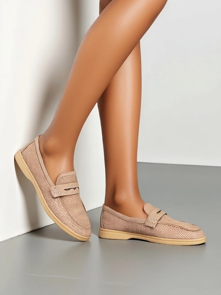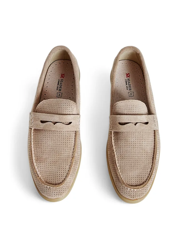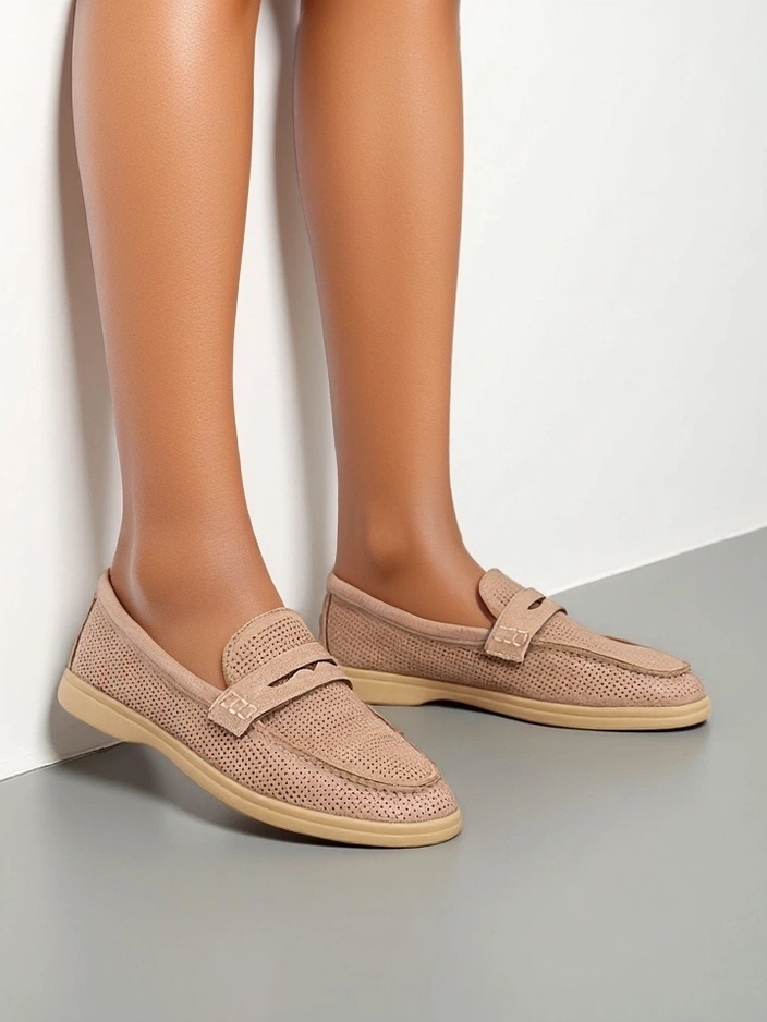 - Перфорирани дамски мокасини с равна подметка. Модел, изработен от екологично чист набук с хастар от естествена кожа. Идеално допълнение към ежедневните тоалети!