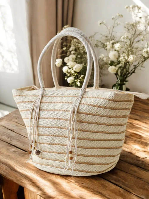 - Голяма дамска чанта, изработена от плетена слама. Моделът разполага и с джоб с връзка. Идеален аксесоар за летни тоалети!