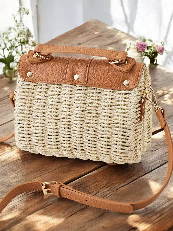 - Мини куфар тип раничка, изработен от ратан. Моделът разполага със закопчаване с копче. Вътрешността е с текстилно покритие. Те ще бъдат перфектният аксесоар за всяко лятно облекло!