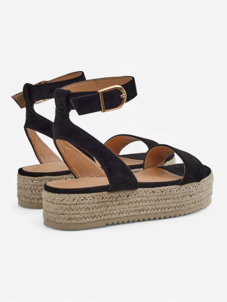 • Обувки на платформа за жени. Саналите са изработени от еко-суед и имат стелка от еко-кожа. Обувките разполагат с катарама и имат декоративна подметка, изработена от юта. Перфектни за създаване на модни летни аутфити!