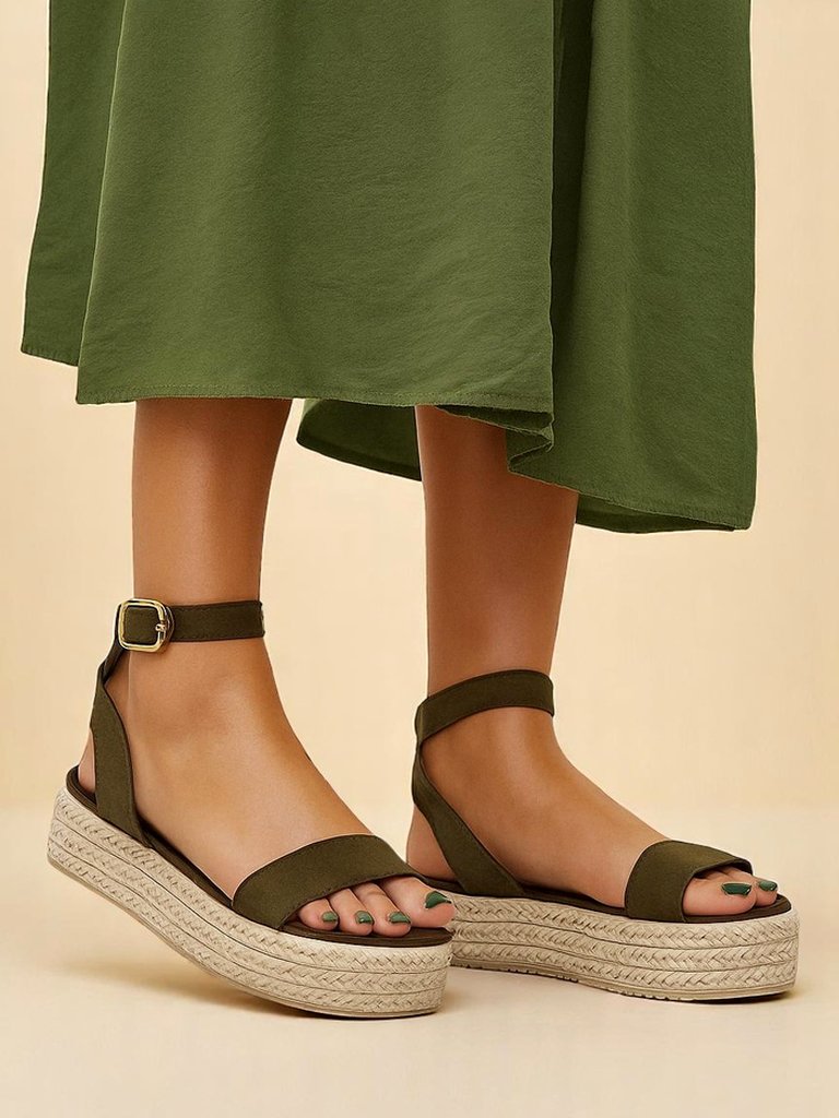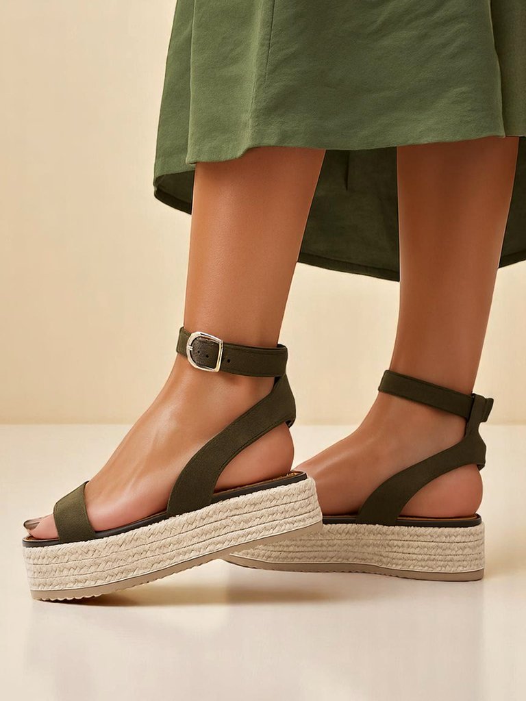 - дамски платформи сандали. Сандалите са изработени от еко велур и имат стелка от еко кожа. Обувките са с катарама и имат декоративна подметка от юта. Перфектни за създаване на модни летни аутфити!
