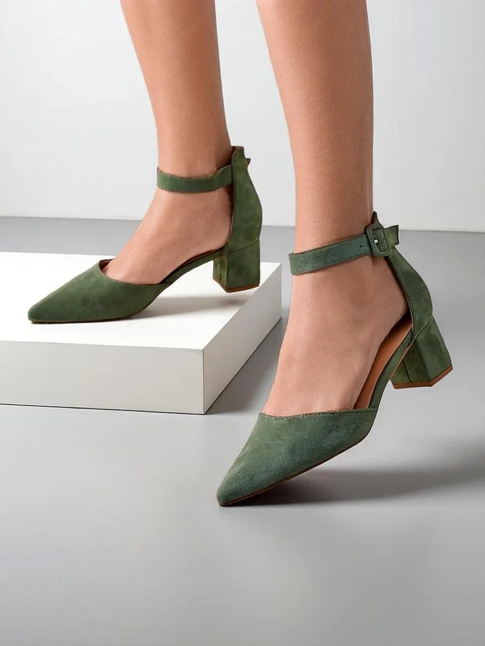 - Стилни дамски обувки на нисък ток с остър нос. Горната част е изработена от изкуствен велур, стелката е от изкуствена кожа. Моделът се закопчава с катарама, идеален за офиса!