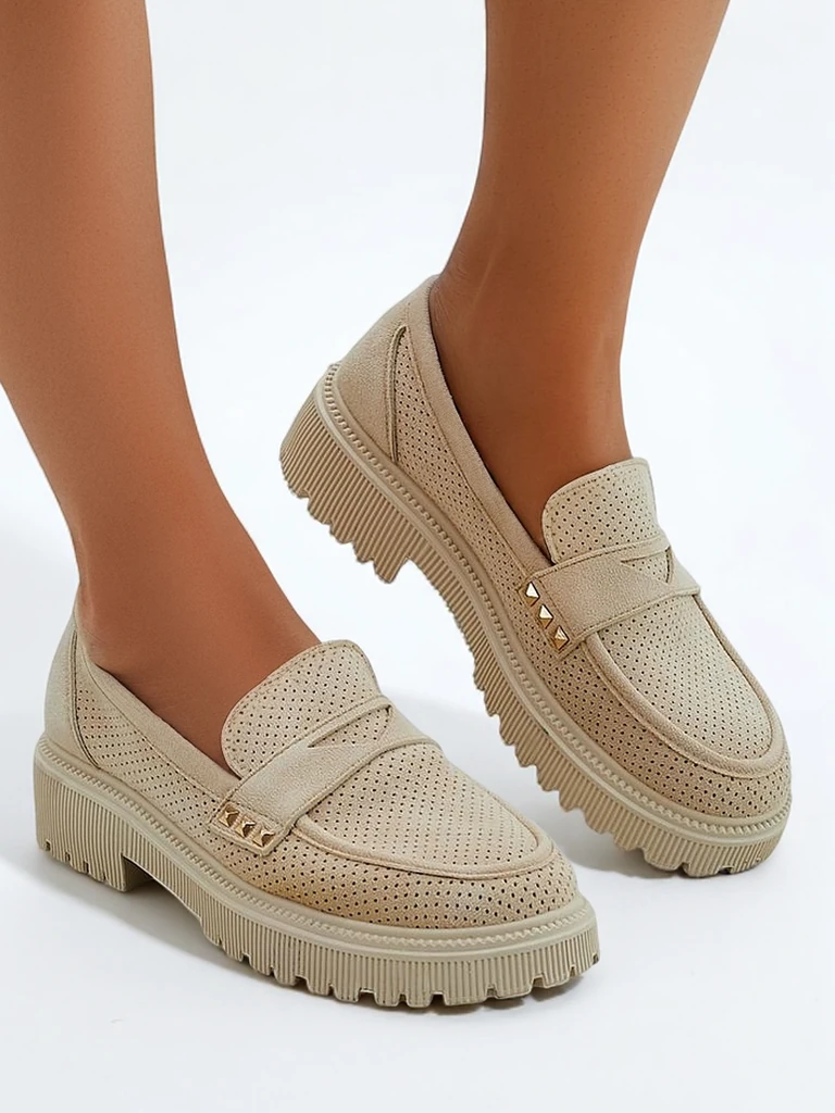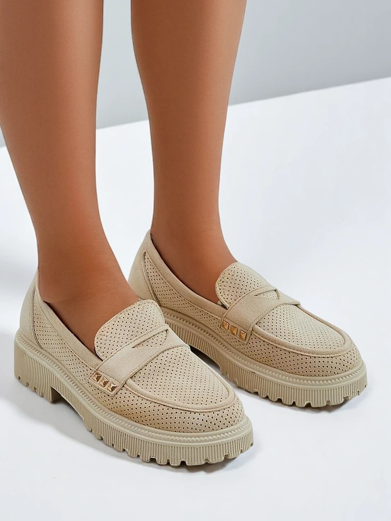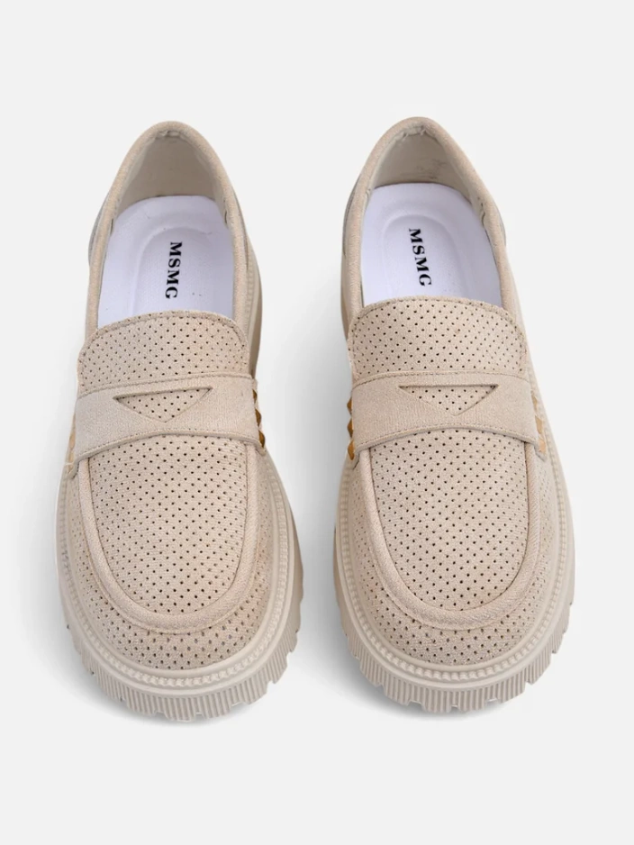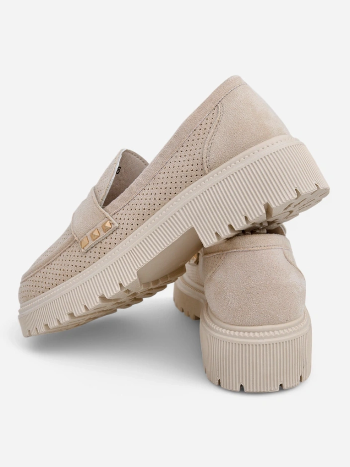 - Светли женски мокасини на плоска подметка. Моделът е в непринуден стил и е изработен от екологично суедно кожа, с екологична кожена стелка. Перфектни за пролетни аутфити!.