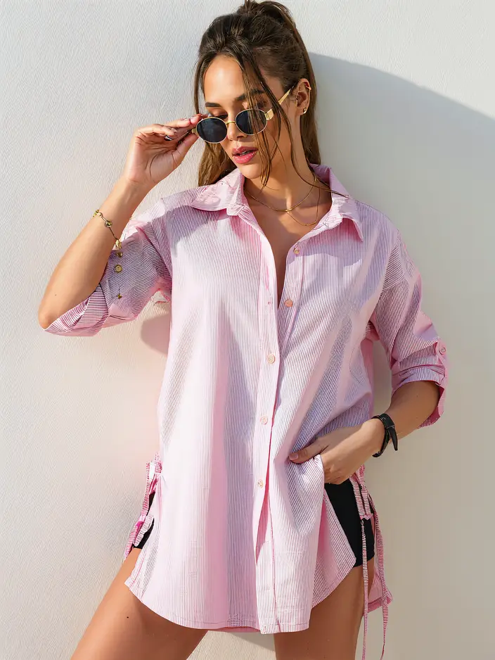 - Дългата риза с райе за жени от памук с връзка на талията е комбинация от комфорт и стил. Леката материя и прилягащият кройка подчертават силуета, създавайки модерен и неформален вид. ЗАБЕЛЕЖКА: Точност на измерванията (+/-) 1 см.