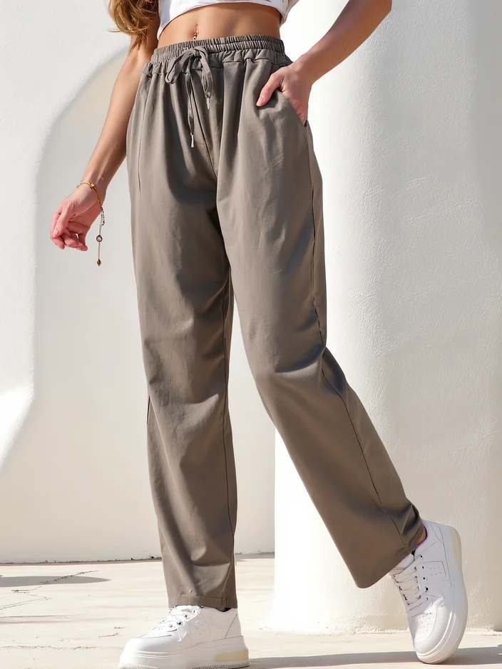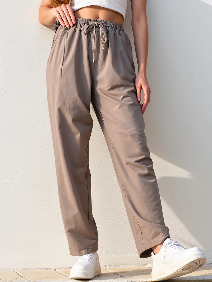 - Широки панталони от лека материя, моделът разполага с еластичен колан и два джоба. Удобни и уютни! ЗАБЕЛЕЖКА: Точност на измерването (+/-) 1 см.