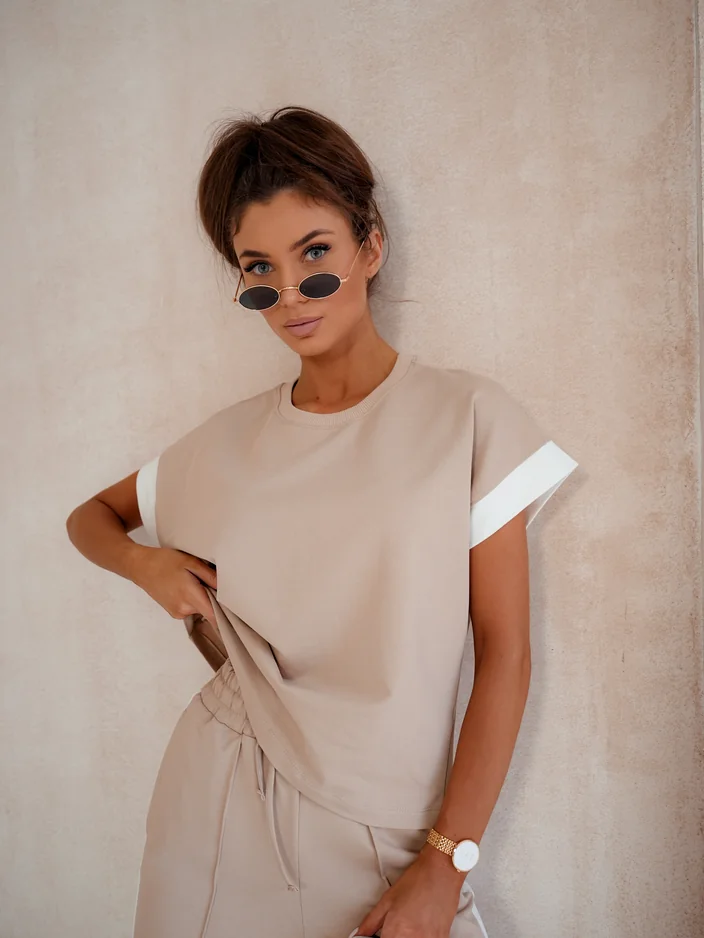 Royalfashion Дамски памучен комплект с къс ръкав и разширяващи се панталони