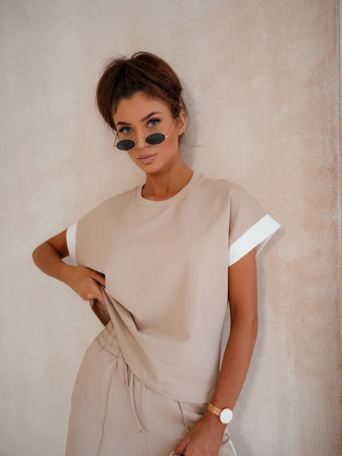 - Дамски удобен сет, изработен от приятна материя. Блузата се накисва през главата, има къси ръкави и кръгло деколте. Широки панталони с ластик на талията. Перфектен за тези, които ценят комфорта.