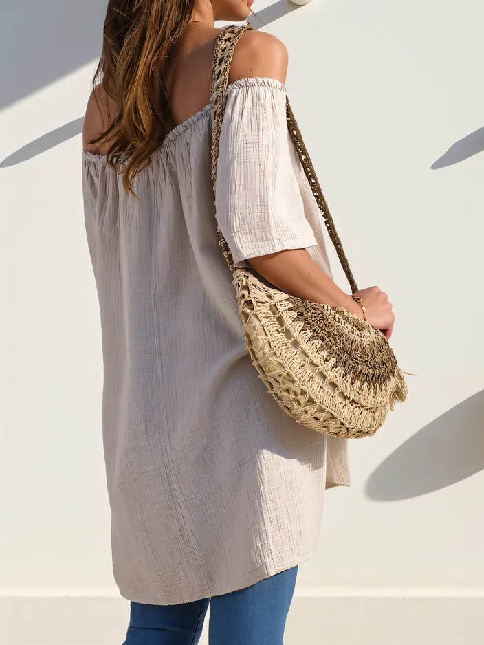 - Елегантна женска памучна блуза в испански стил с фини декоративни копчета. Перфектна за топли дни, съчетава комфорт с женствен и романтичен стил.