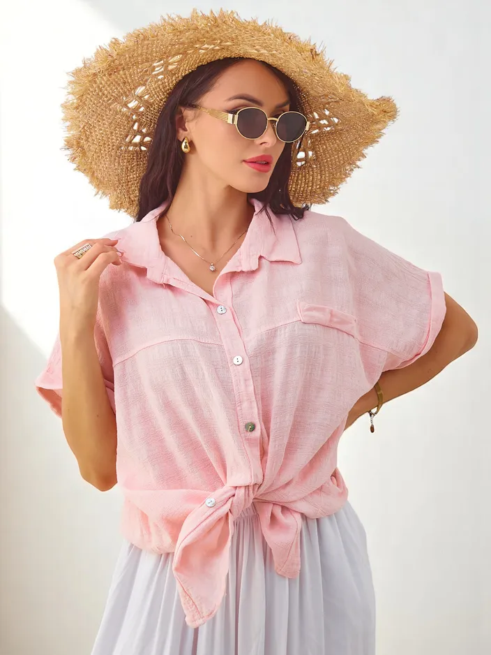- Памучна дамска риза с релеф и къс ръкав. Модел с V-образно деколте, с копчета. Задължителен елемент в гардероба на всяка жена!