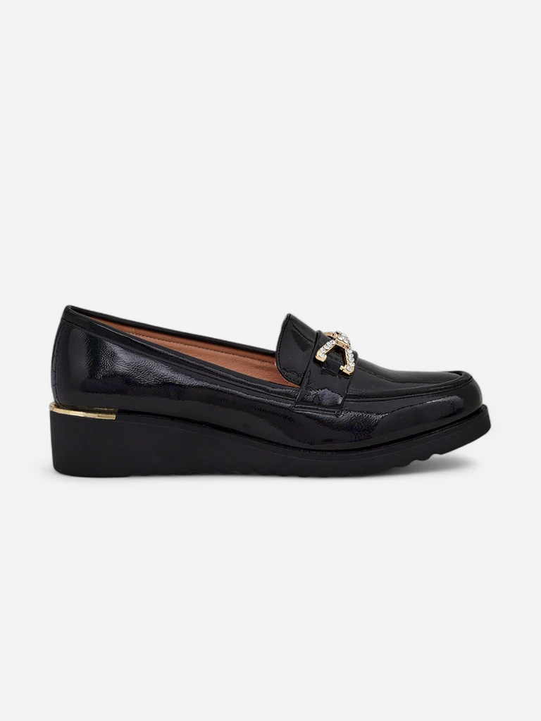 - Красиви женски мокасини на нисък ток. Моделът е удобен в задната част и е изработен от еко-кожа и естествени кожени стелки. Пръстите са закръглени и украсени с златисти елементи с цирконии. Идеална основа за много ежедневни визии!