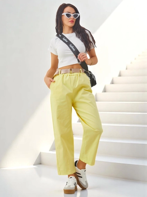 - По-широки панталони, направени от лек материал, моделът разполага с еластична талия. Удобни и уютни! ЗАБЕЛЕЖКА: Точност на измерванията (+/-) 1 см.