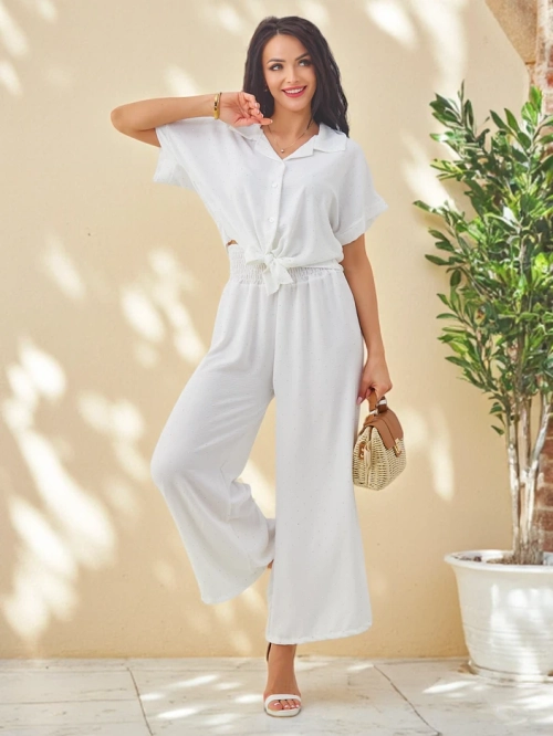 - Женски ежедневен комплект от приятна материя. Ризата с копчета има връзка в долната част и къси ръкави. Широките панталони с ластик на талията. Целият комплект е украсен с камъчета!